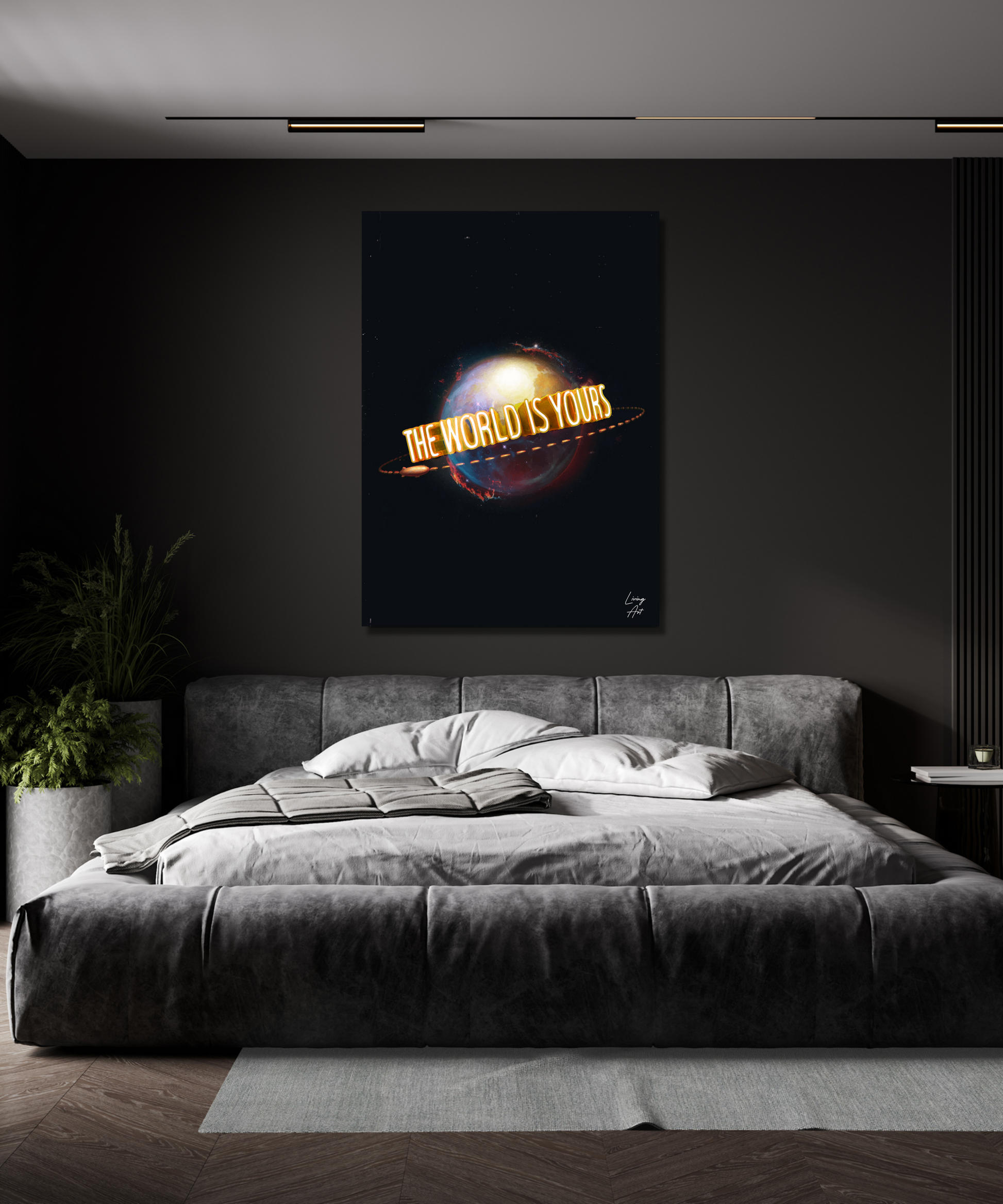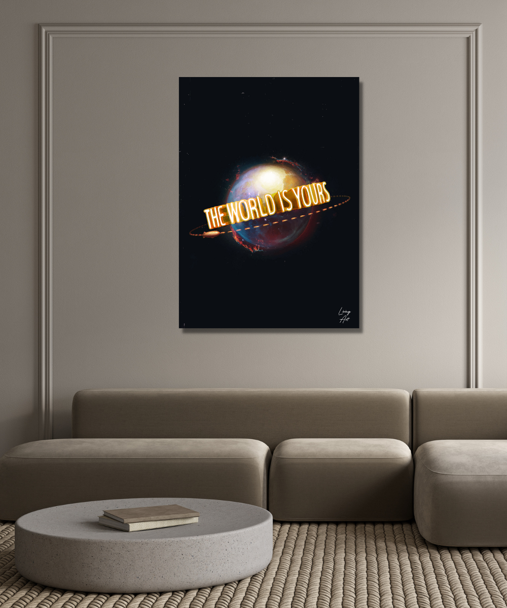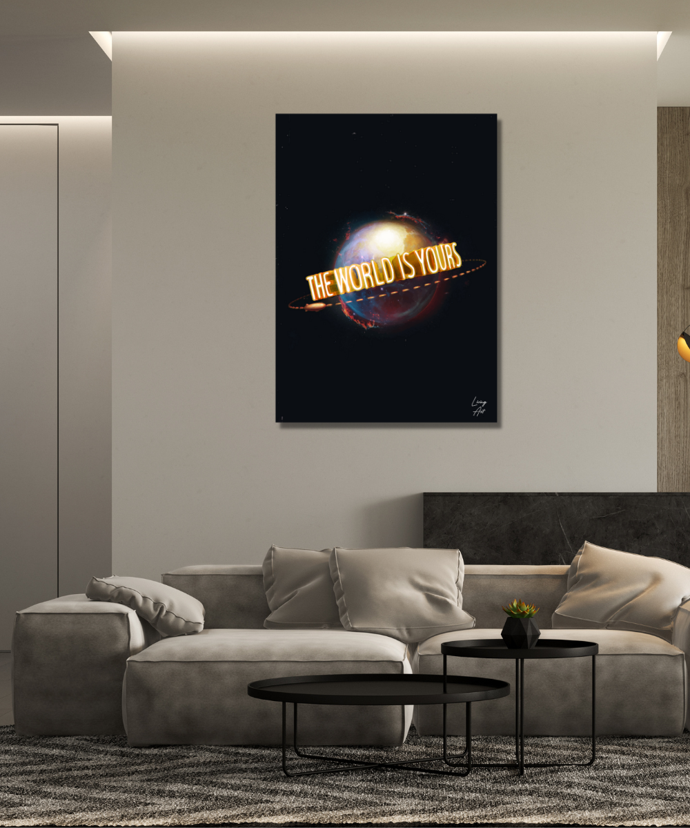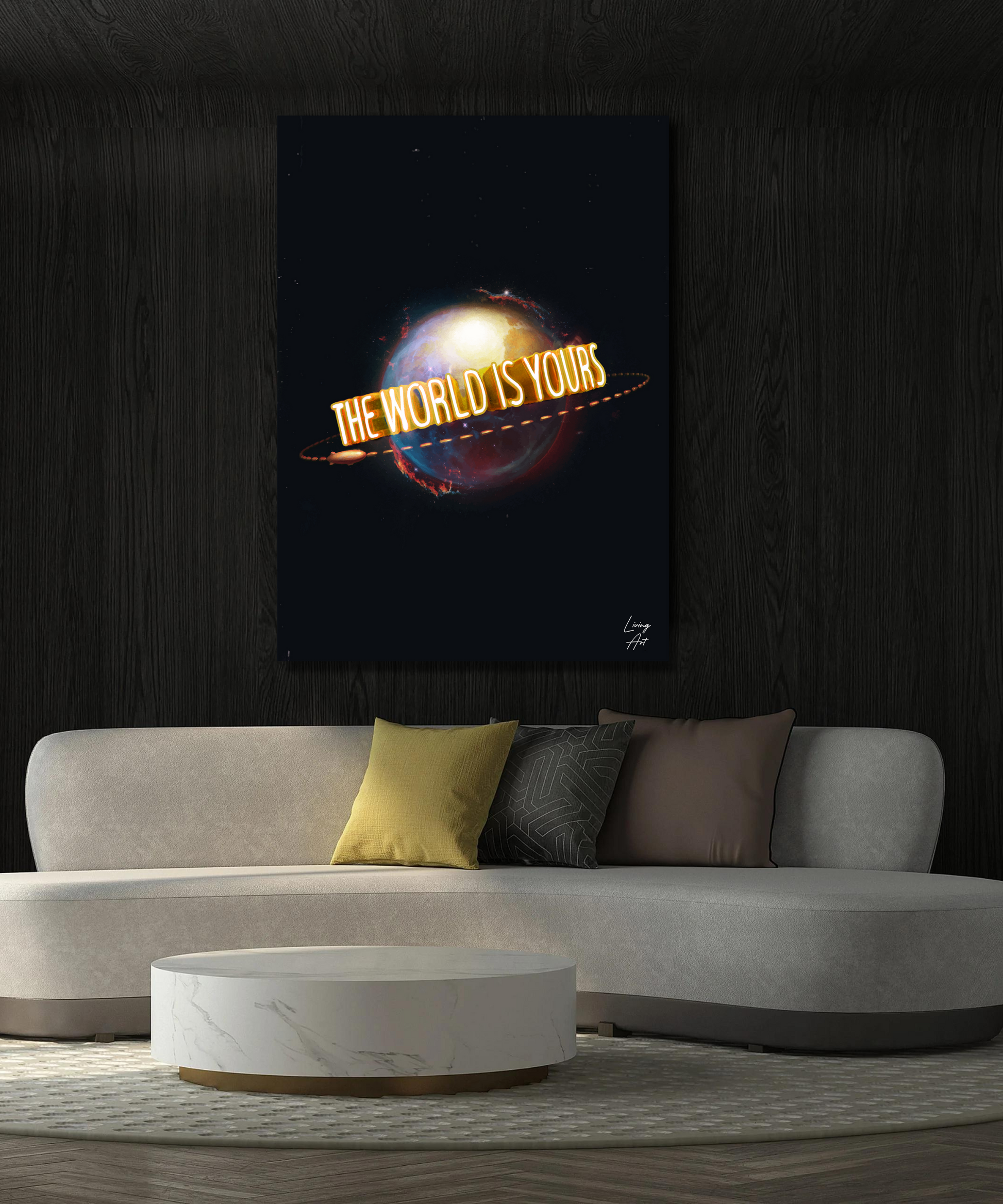 Maak kennis met onze exclusieve luxe The World Is Yours muurkunst, een motiverende en inspirerende toevoeging aan elke ruimte. Dit prachtige stuk heeft een handgeschilderde afbeelding van de iconische zin "The World Is Yours," die over een wereldbol zweeft in een zee van levendige kleuren. De ingewikkelde details en elegante kwaliteiten van het schilderij zullen zeker indruk maken, waardoor het het perfecte middelpunt is voor elk interieur.